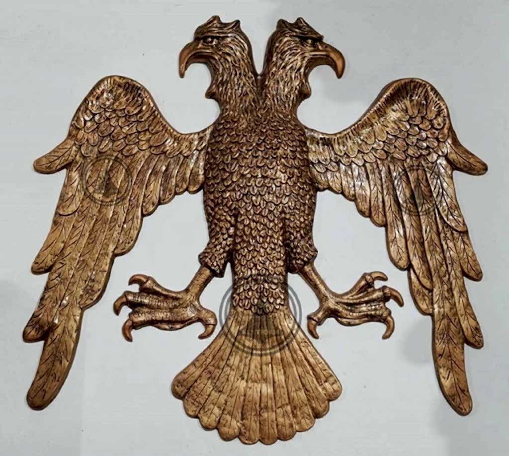 Çift Başlı Kartal Rölyef Heykeli sağlam malzeme olan cam elyaf takviyeli polyester karışımlı (CTP) malzemeden imal edilmiş Bronz patina yöntemi ile Bronz görünüm sağlanmıştır.