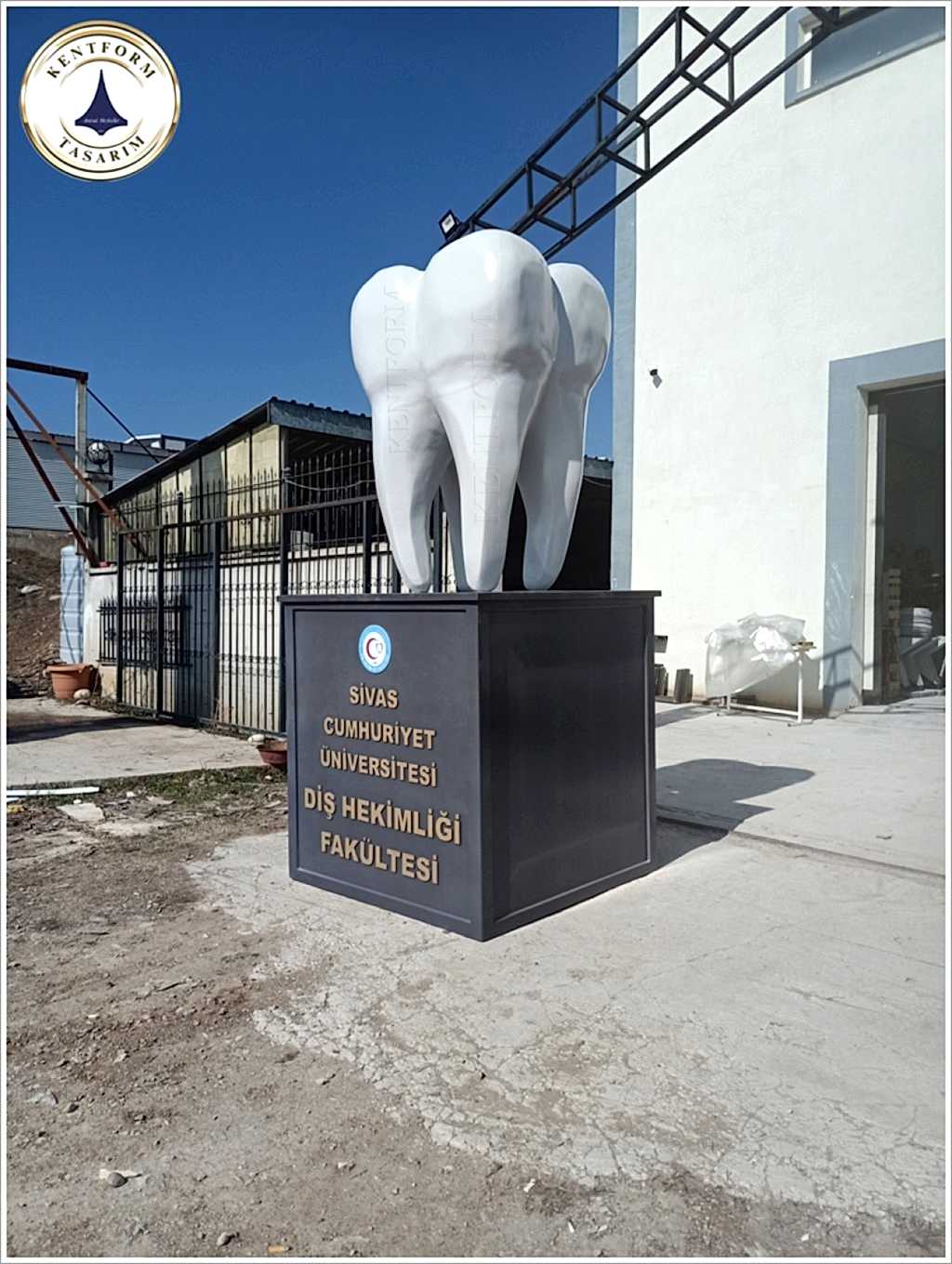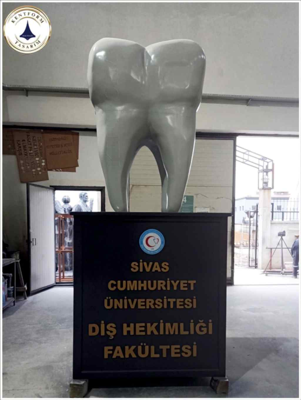 Özel proje uygulamalı diş heykeli yapımı,özel modelleme olarak işlenmiş sağlam malzeme cam elyaf takviyeli fiberglas malzemeden heykel imalatı hazır kaidesi ve kaide üzerinde yer alan konu ile ilgili yazısı yüksek kabartma tekniğinde tamamlanmıştır.