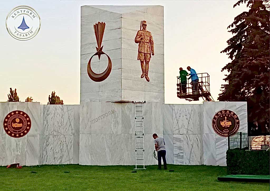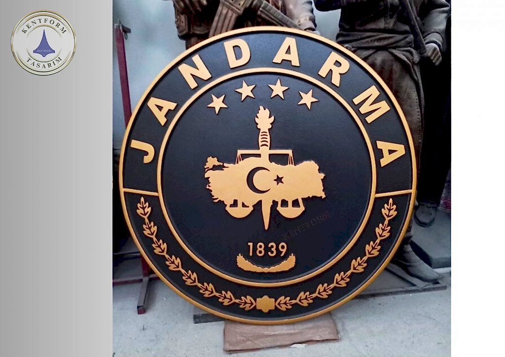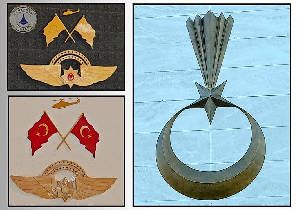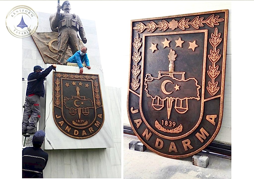 Türk Silahlı Kuvetleri ne ait kurumları temsil eden kurumsal logo çalışmaları öncelikle rölyef tekniğinde yüksek kabartma rmodelaj çalışmaları yapılıp iç ve dış mekan heykel çalışmalarında kullanılan cam elyaf takviyeli polyester karışımlı fiberglas malzeme ile çalışmanın imalatı tamamlandıktıktan sonra bronz patina ile istenilen bronz renkler uygulanır.