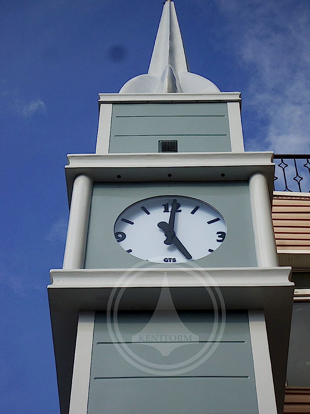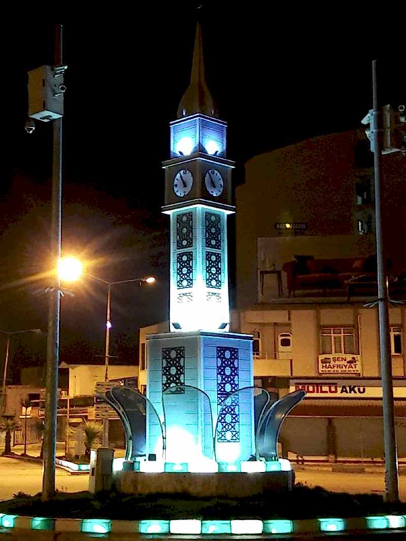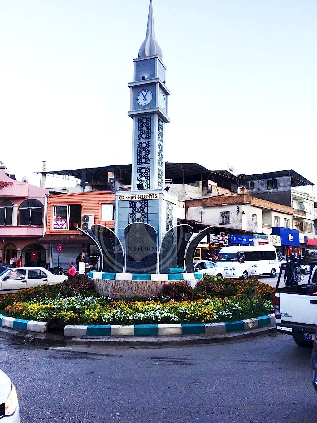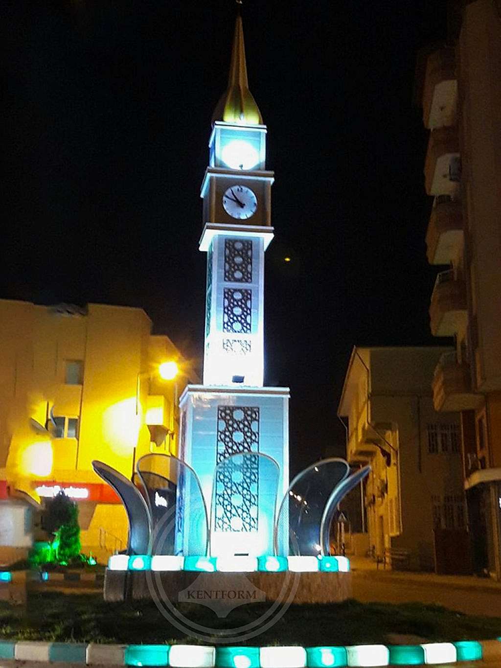 Modern form saat kulesi modeli çelik konstrüksüyonlar üzerine reçine polyester karışımlı fiberglas malzemeden imal edilmiştir.Saat kulesinde çalışmasına lazer kesim motiflerle dekorlar eklenerek estetik değer kazandırılmıştır.