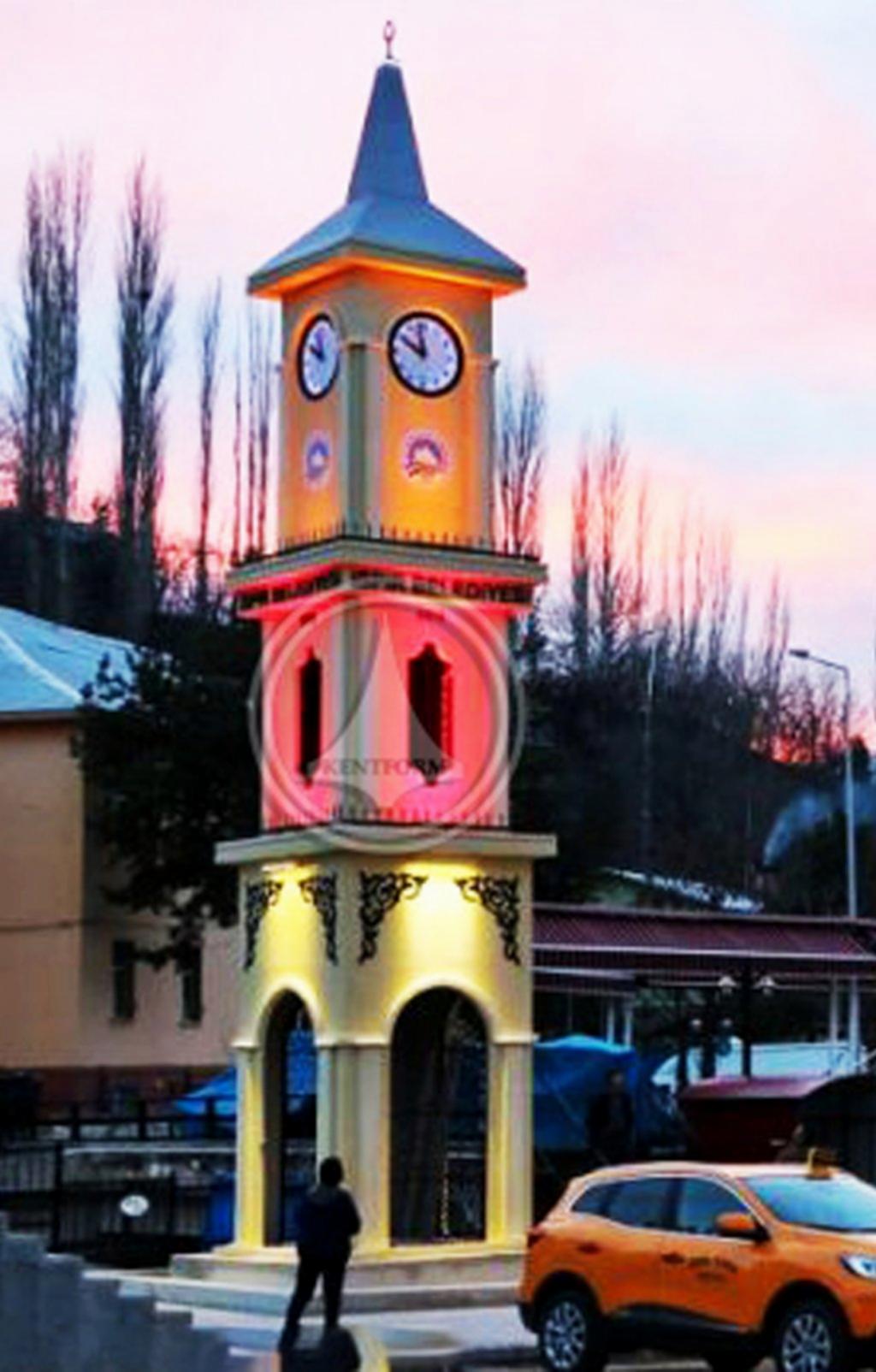 Selçuklu motifli saat kulesi modeli çelik konstrüksüyonlar üzerine reçine polyester karışımlı fiberglas malzemeden imal edilmiştir.Saat kulesi çalışmasında Selçuklu motifler eklenerek estetik değer kazandırılmıştır.