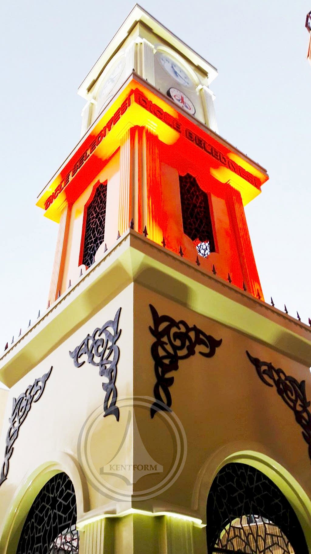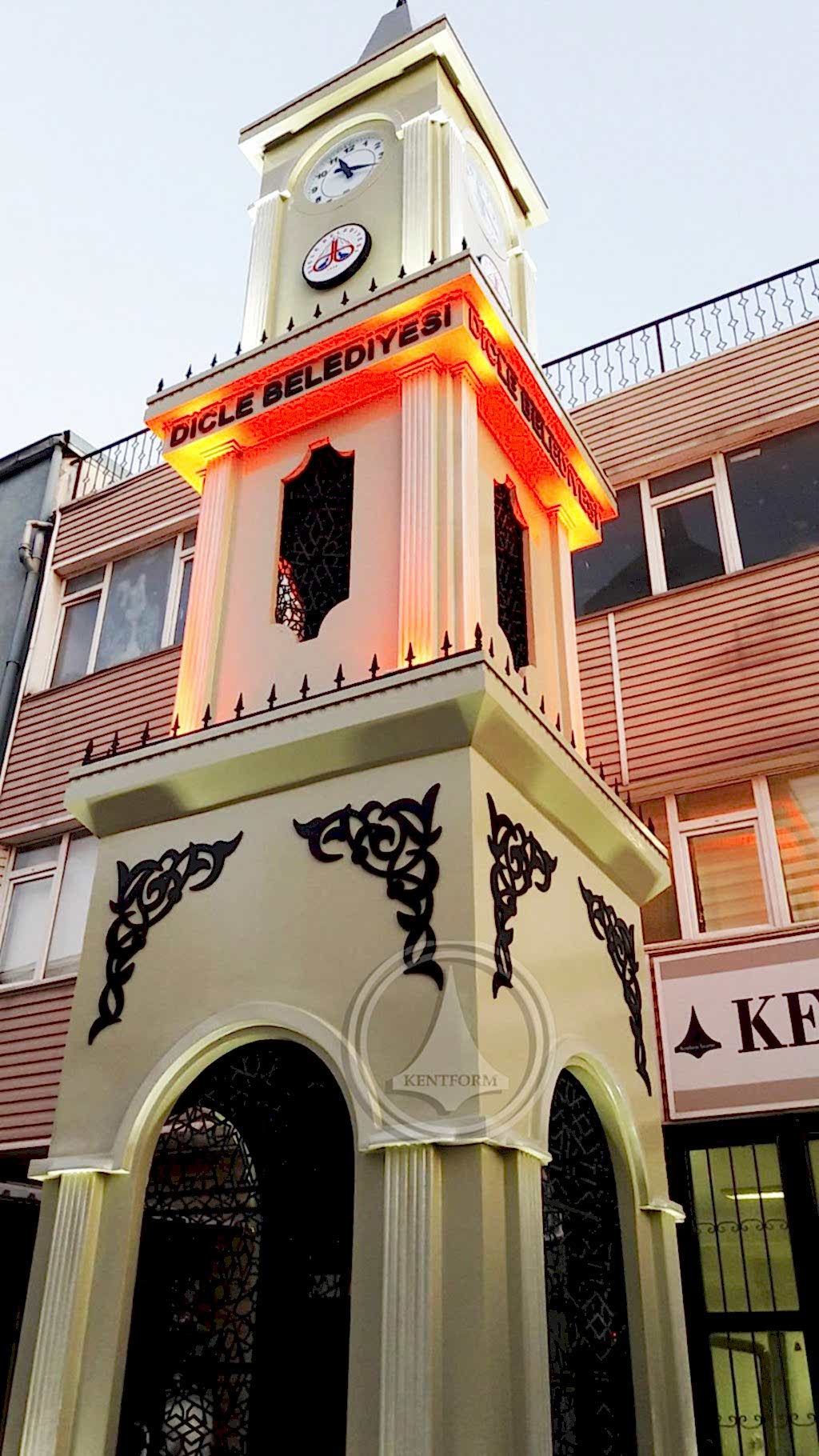 Selçuklu motifli saat kulesi modeli çelik konstrüksüyonlar üzerine reçine polyester karışımlı fiberglas malzemeden imal edilmiştir.Saat Kulesinde Selçuklu motifli dekorlar eklenerek estetik değer kazandırılmıştır.