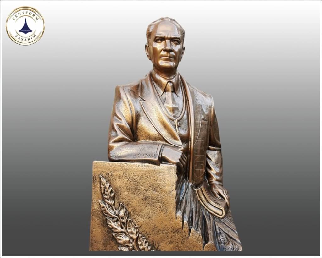 Atatürk Heykeli Tasarım Bilgisi; Kürsülü model Atatürk Heykelinde Kürsü taştan oyulmuş izlenimi yaratılarak Atatürk’ün gövde ve yüz kısmı tasvir edilmiştir. Atatürk’ün sol elinde Nutuk kitabı, sağ elinde kürsü üzerinde Kürsü ön cephesine defne dalı motifi yer almaktadır.Atatürk Heykeli çalışmasına başlanmadan önce Atatürk'ün yüz ifadesindeki detaylar,duruşu ve lider ruhu en ince detayına kadar etüt edilerek heykel atölyemizde modellenmiştir.Atatürk heykeli imalatında cam elyaf takviyeli polyester karışımlı fiberglas malzeme kullanılmaktadır talep edilmesi durumunda BRONZ döküm heykel olarak Atatürk Anıtsal Heykel üretimi yapılmaktadır.Atatürk Heykelleri eserlerimiz özgün modelleme çalışmalardır.Atatürk Heykelleri eserlerimiz heykel atölyemize özgün yeni modelleme Atatürk Heykeli çalışmasıdır.Atatürk Heykeli modelaj çalışması Sanatçı Aslan Başpınar tarafından modellenmiştir.Eserde başarılı patina yöntemi ile canlı tabii bronz etkisi vurgulanmıştır.