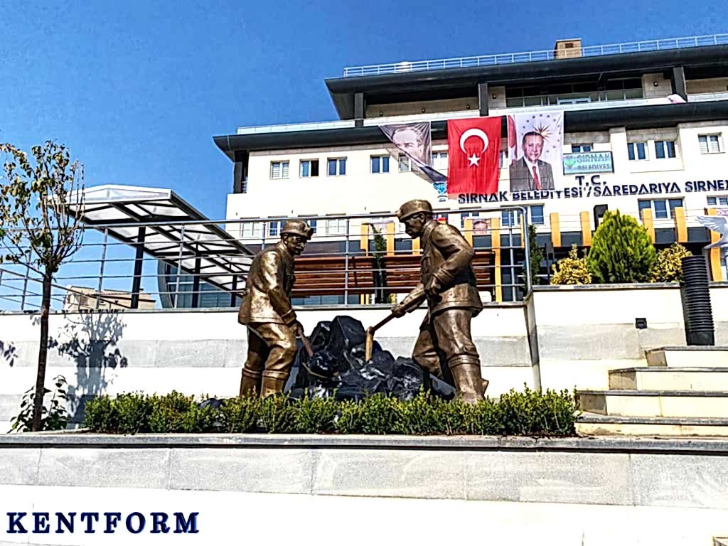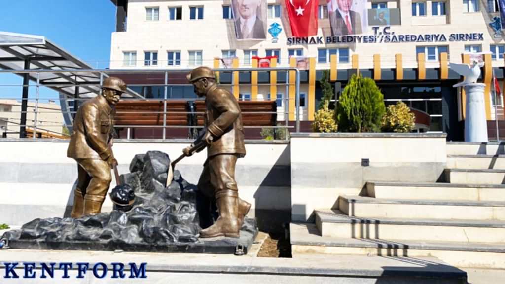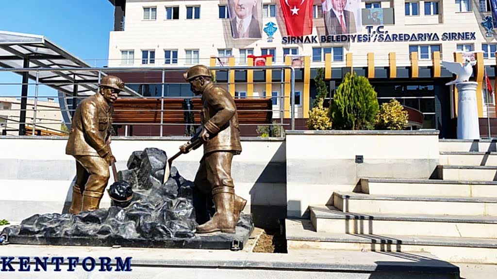 Maden İşçisi Anıtsal Heykeli; Elinde kazma ile kömür kazan maden işçisi ve kazılan kömürleri kürekle toplayan kürek işçisi madenci kıyafetleri ve başlarında baretlerle 180 cm yüksekliğinde çalışılmıştır. Maden İşçilerinin detaylı görselleri etüt edilip model kili kullanılarak modelaj çalışmaları tamamlandıktan sonra BRONZ döküm malzemeden imal edilmiştir.